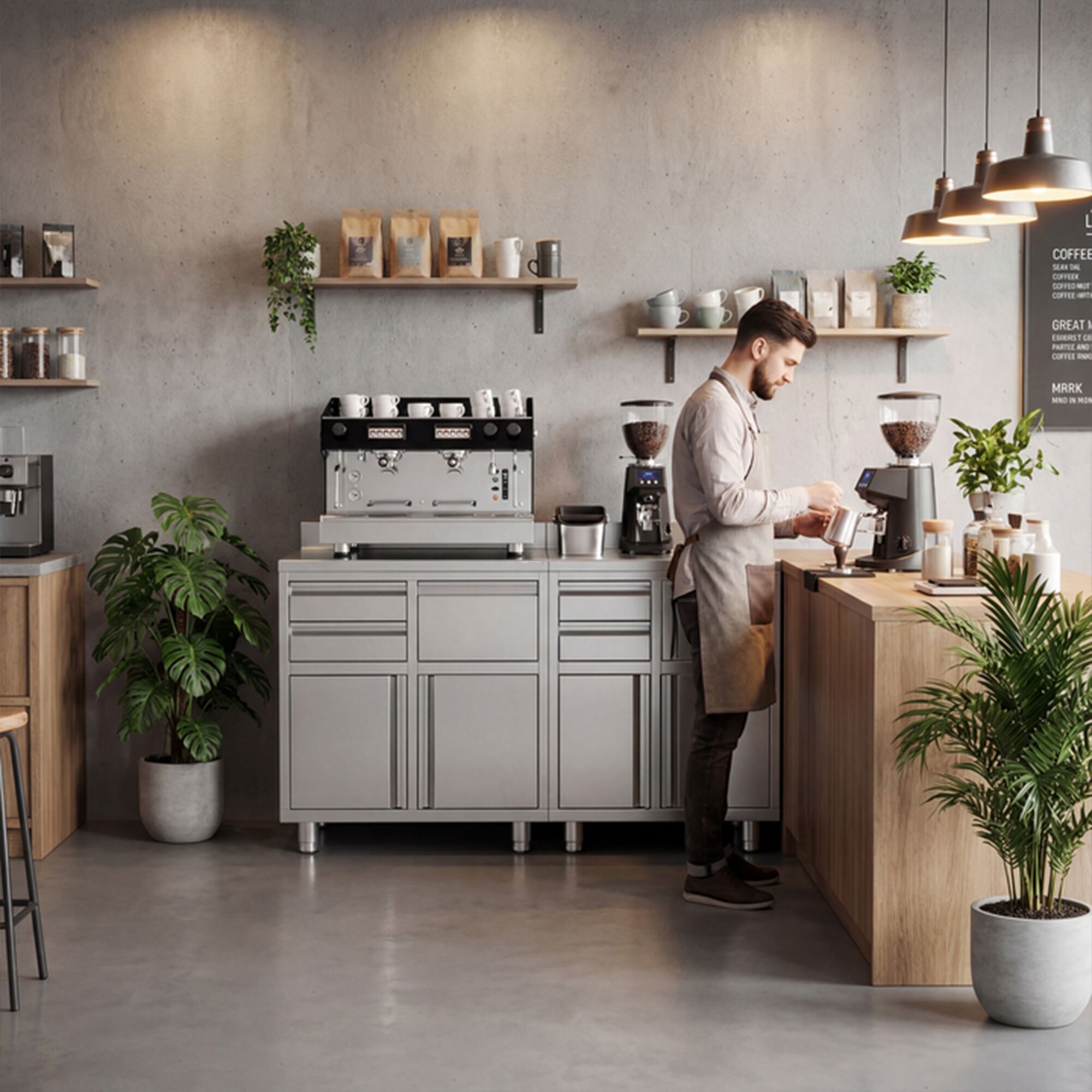 Commercial Work Cabinet - Coffee Machine Cabinet – with 2 Drawers, 1 Door, Waste Bin & Upstand